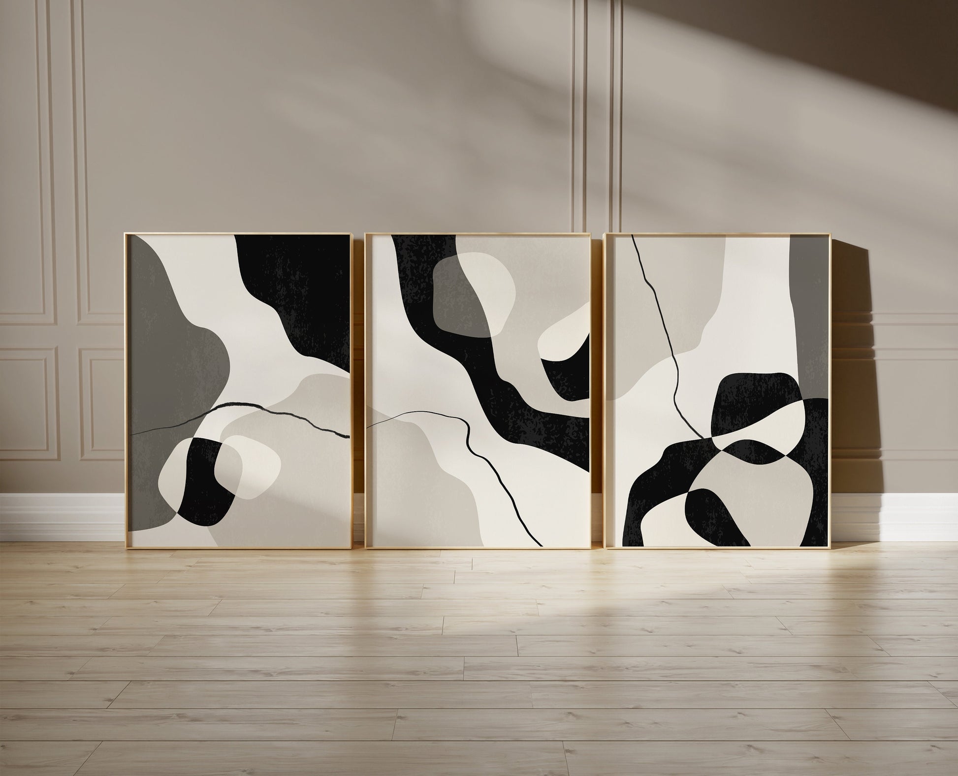 Set of 3 beige, taupe and black abstract wall art prints all set on a pale cream background. These are full colour borderless prints.
