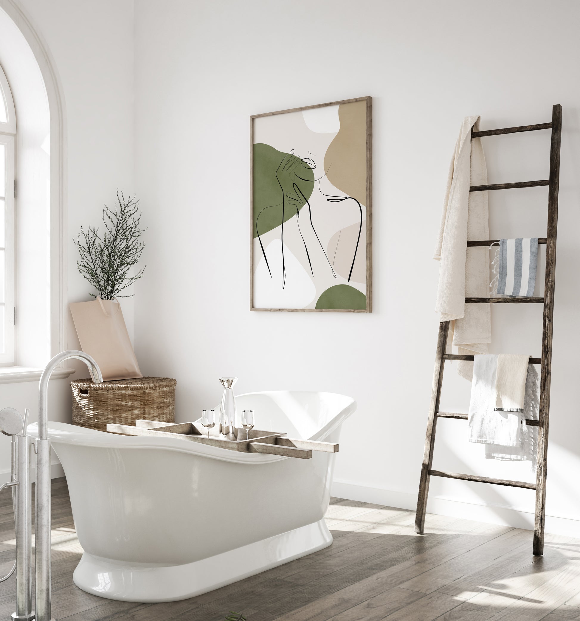 Set of 3 bathroom wall art prints in watercolour shades of warm beige, light beige, olive green and white on pale beige backgrounds. These are full colour borderless prints.