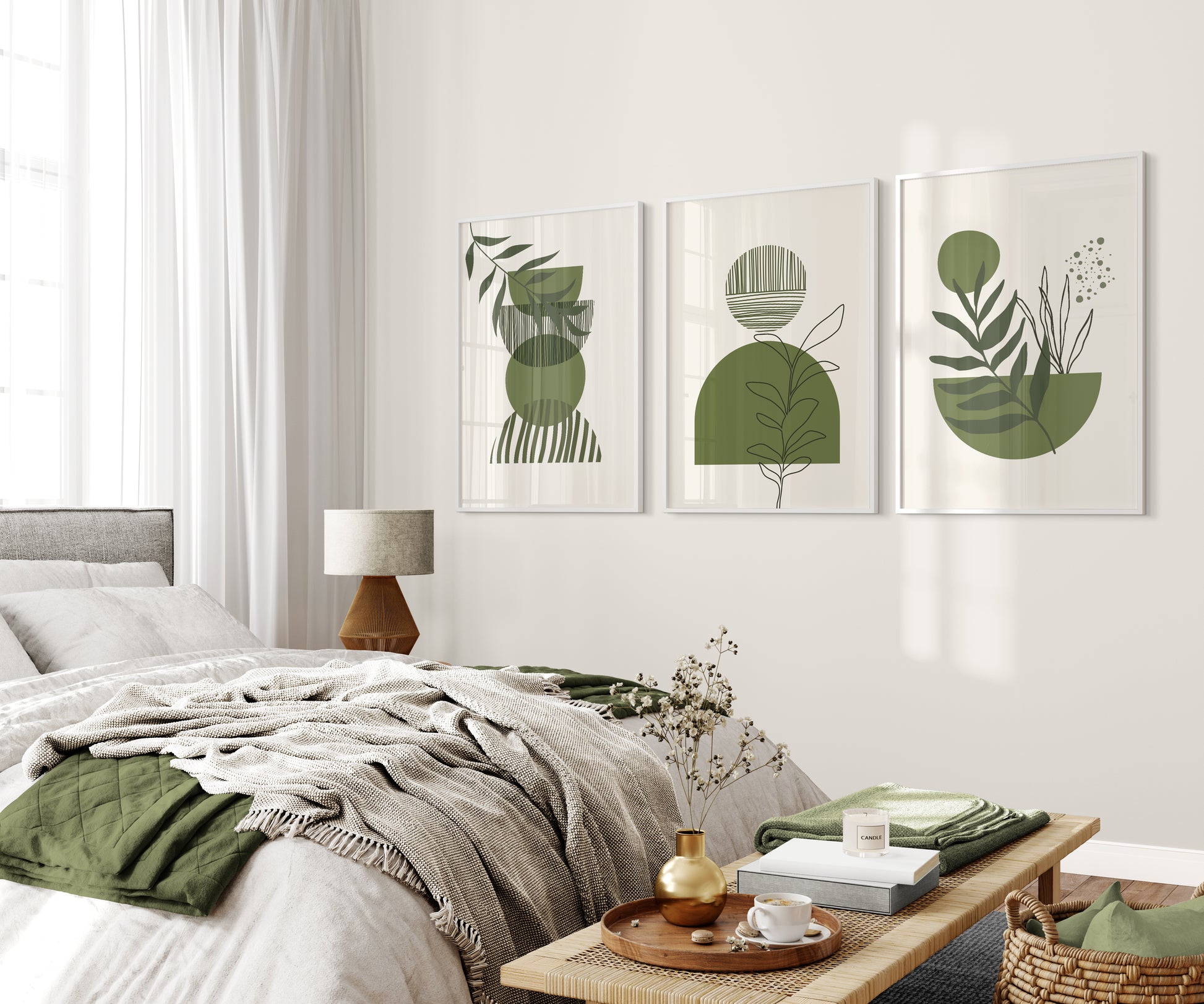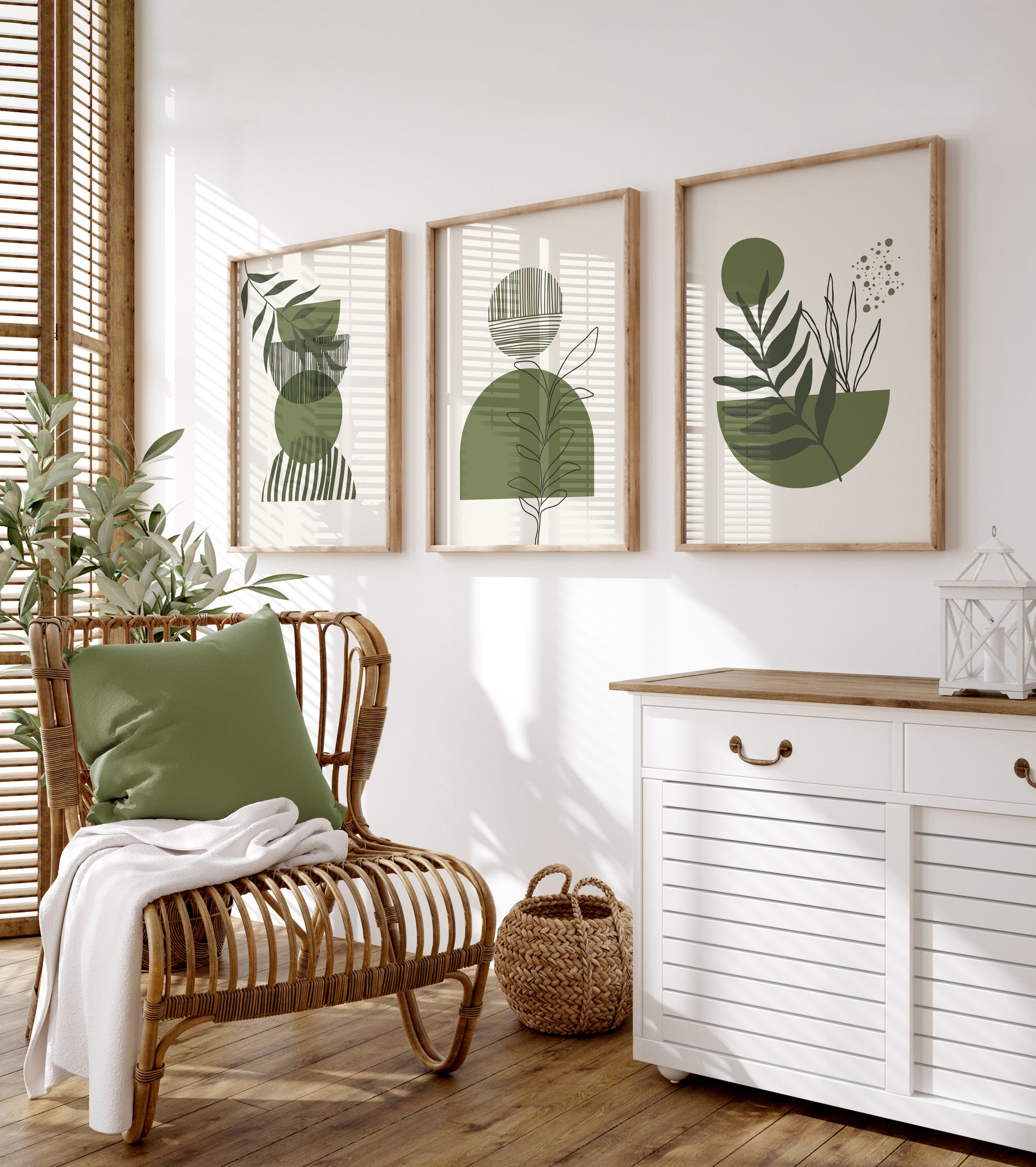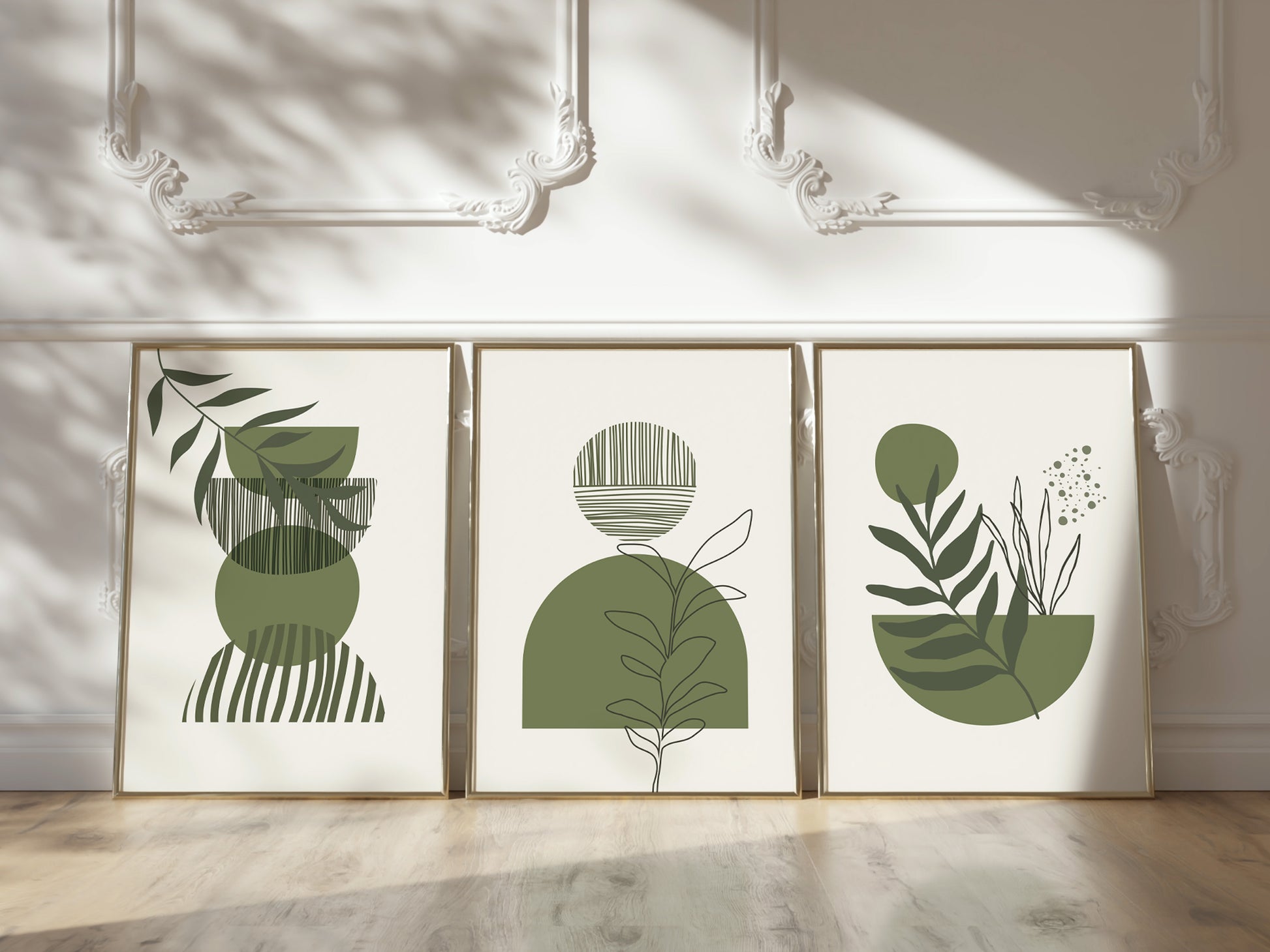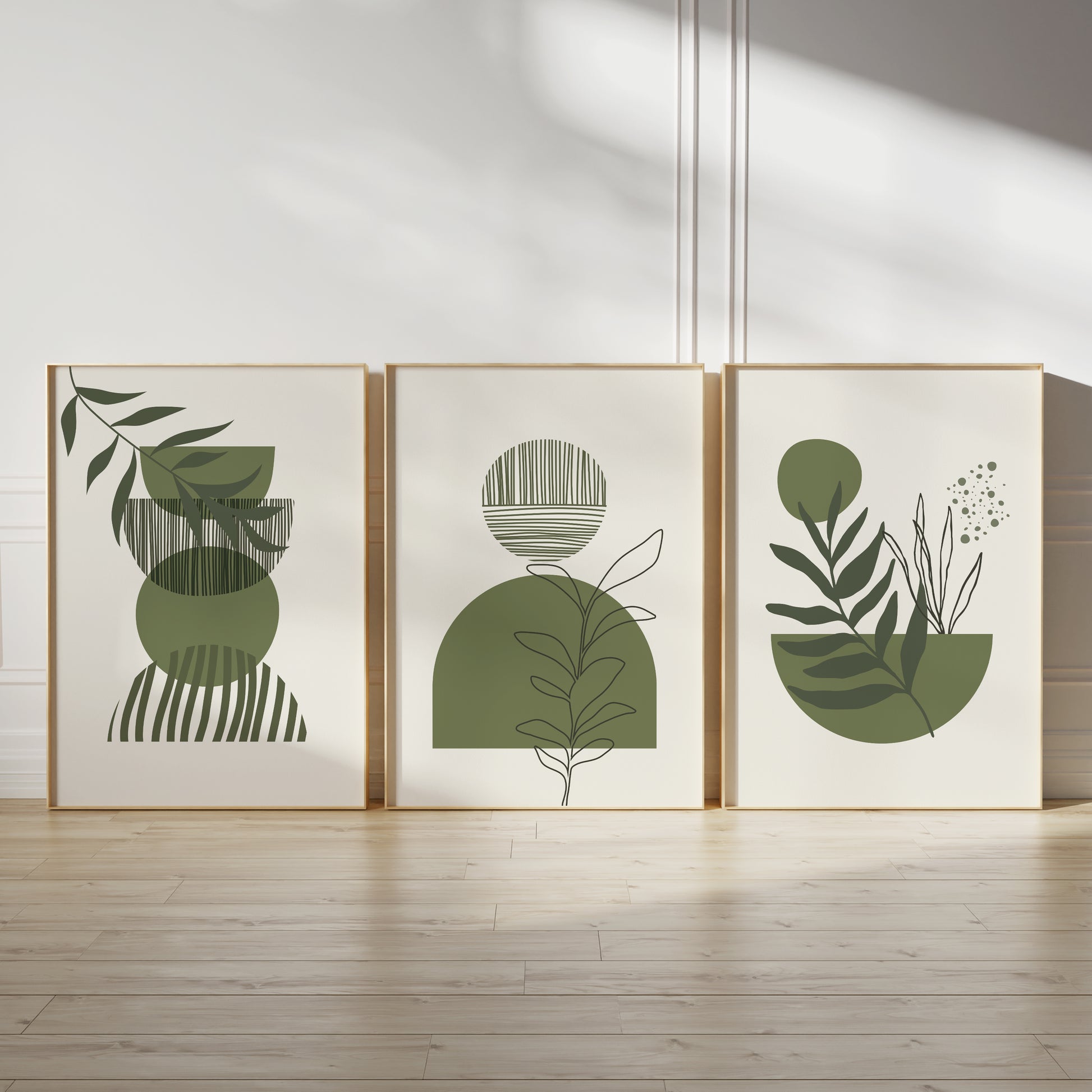 Set of 3 olive green boho wall art prints in shades of olive green all set on a off white backgrounds.