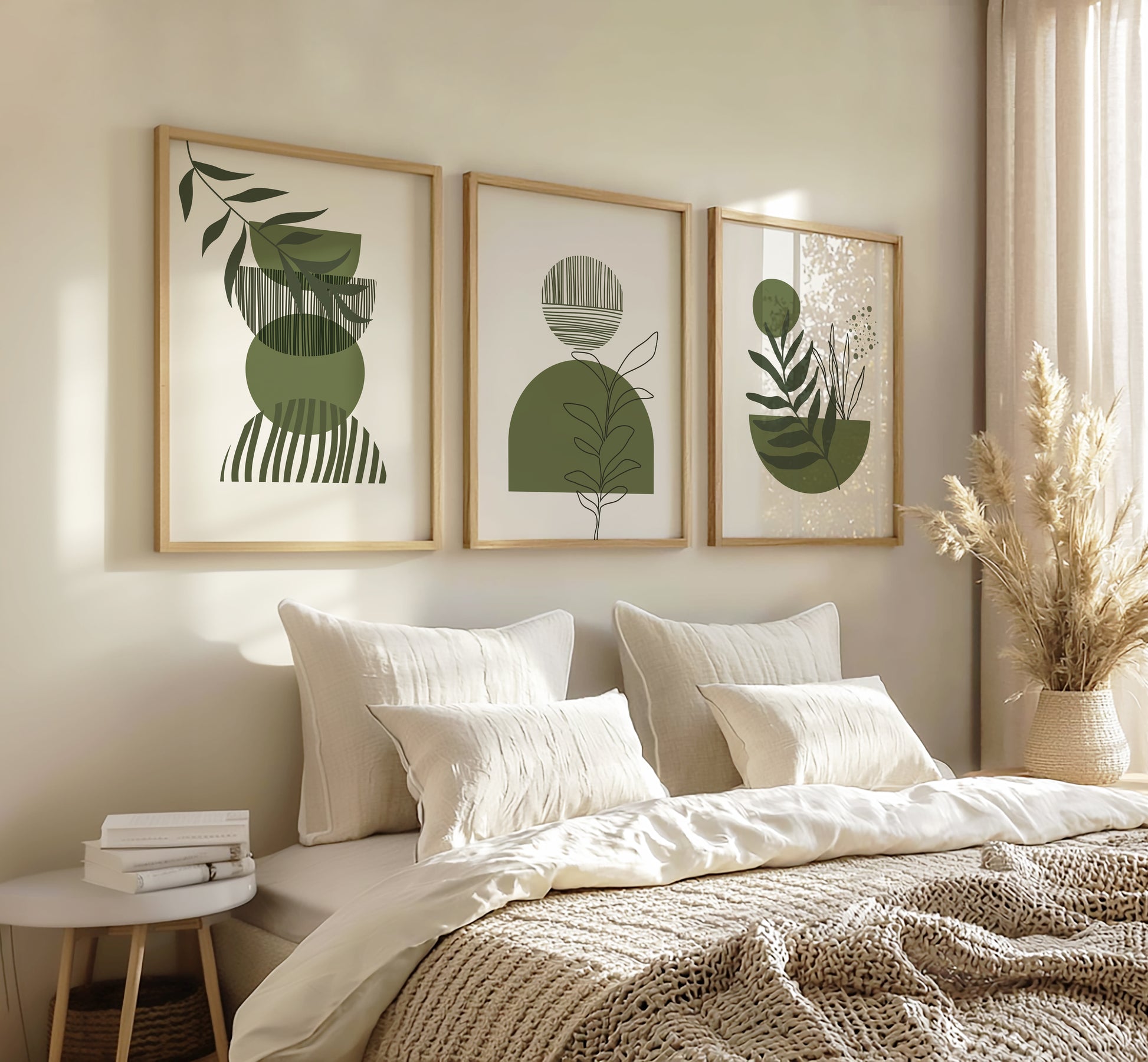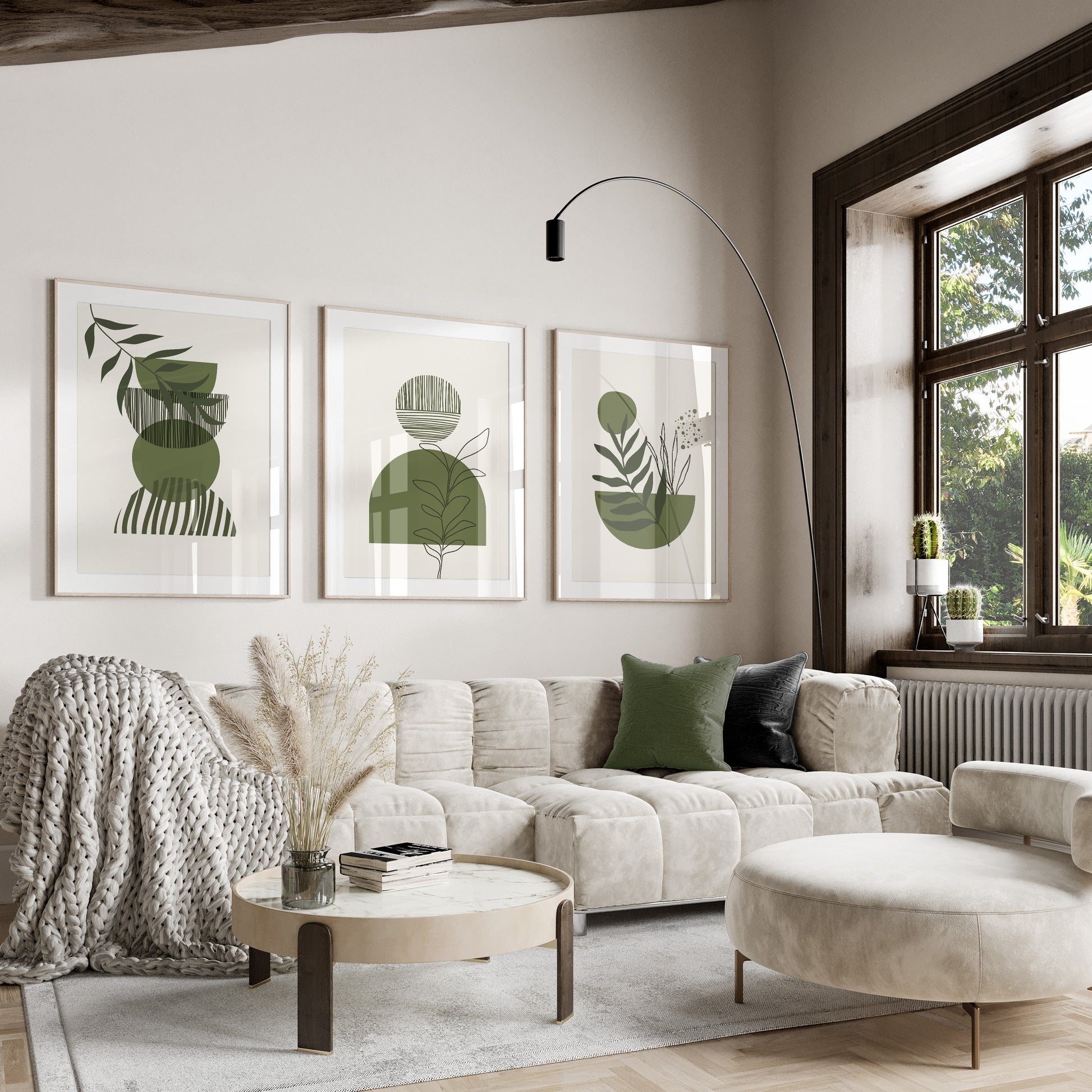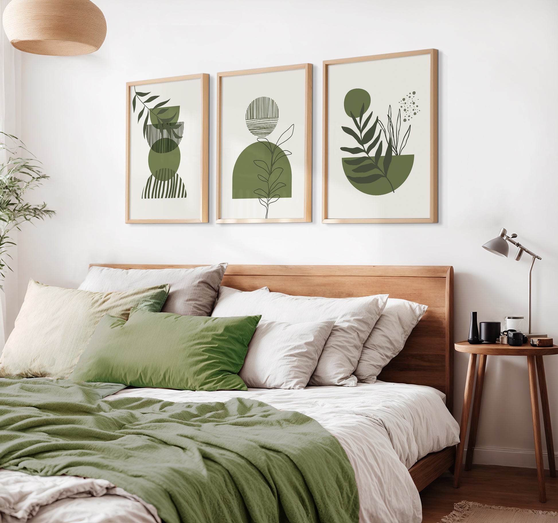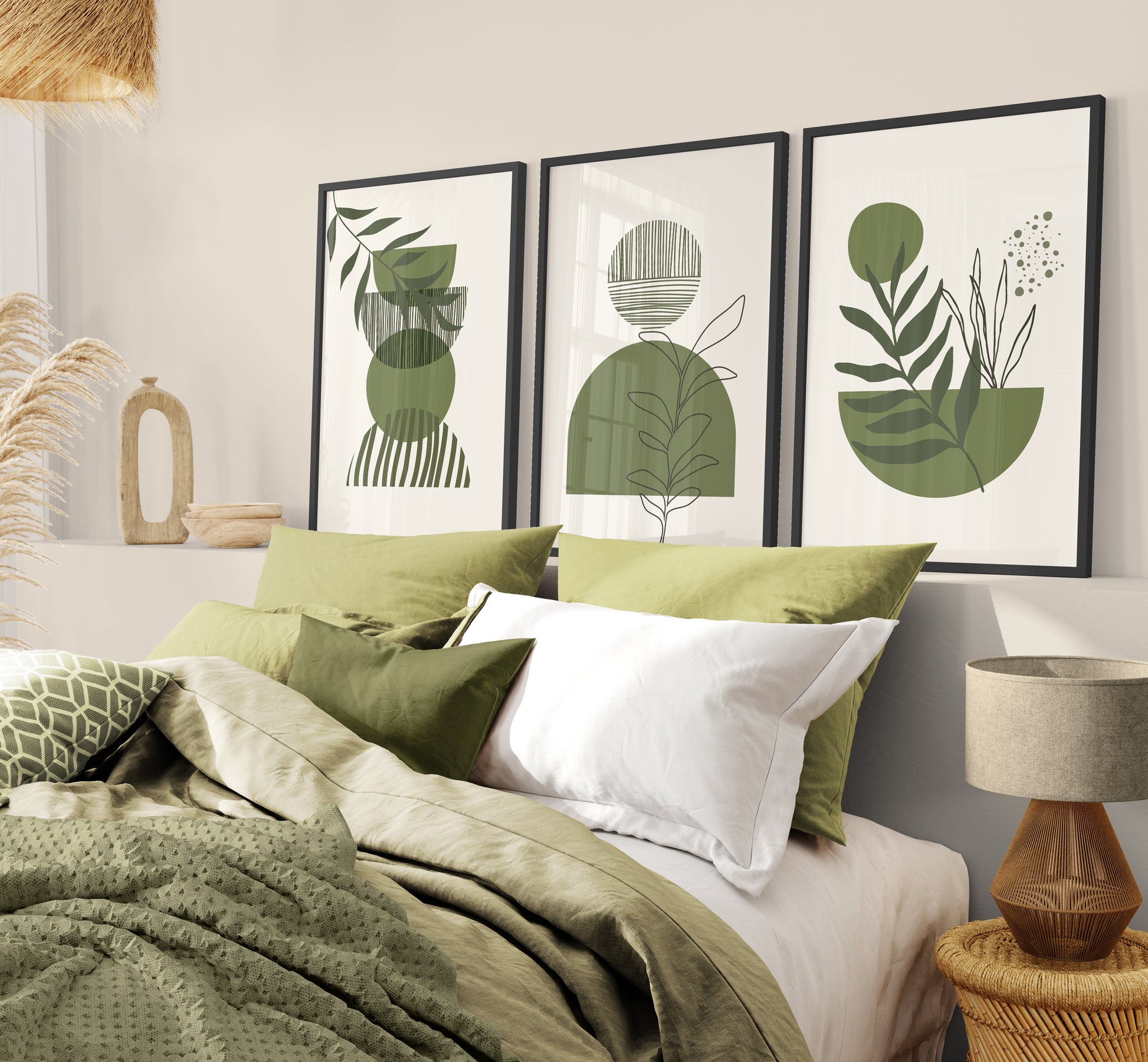 Set of 3 olive green boho wall art prints in shades of olive green all set on a off white backgrounds.